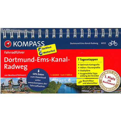 Kompass cykelguider/kort har spiralryg og er trykt på lamineret papir. Serien har modtaget 1.præmie ved verdens største rejsemesse ITB for dens uovertrufne kvaliteter. Lette overskuelige kort i målestokken 1:50.000, selvforklarende symboler, grafisk oversigt over rutens højdeprofil og længde, gennemsnitlige varighed og andre praktiske fakta. Forfatternes tips til de bedste seværdigheder, områdets historie og geografi. De enkelte etaper er tydeligt beskrevet med meget præcise kort og herlige farvefotos. Praktisk liste med overnatningsmuligheder inddelt i prisgrupper inkl. morgenmad.Her følger den tyske beskrivelse af denne guides indhold: Die Radroute am Dortmund-Ems-Kanal ist der Klassiker vom Ruhrgebiet zur Nordsee. Steigungsfrei folgt sie autofreien Uferwegen durch die Parklandschaft des Münsterlandes und das Emsland. In Emden beginnt der Schlussspurt durch die Grünfluren Ostfrieslands zum Nordseeheilbad Norddeich am Wattenmeer.Der zu Kaisers Zeiten eröffnete Dortmund-Ems-Kanal ist beliebt und belebt. Ausflugsschiffe, Yachten und Bootswanderer nutzen den Kanal, ebenso die Angler. In der Hauptwindrichtung lässt sich die rund 350 km lange Radroute auch von Familien mit Kindern leicht durchfahren. Mit dem Wind im Rücken "segelt" man wie von selbst vom Ruhrgebiet an die Nordsee und kann dabei viel Schönes entdecken. Naturschutzgebiete, Deutschlands größte Eisenbahnklappbrücke, malerische Städte oder die Schlösser des Münsterlandes liegen hier sozusagen am Weg.