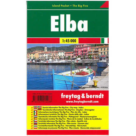 Falset lamineret kort i målestokken 1:45.000 over hele Isola d'Elba med indsat kort over Portoferraio. På bagsiden af kortet er trykt top 5 over oplevelser, restauranter, kultur, natur og seværdigheder.