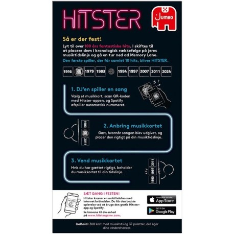 Spillerne skiftes til at lægge 100 rs fantastiske hits i kronologisk rækkefølge på hver sin tidslinje. den spiller, som først samler 10 hits, vinder spillet og titlen Hitster