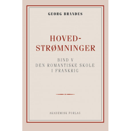 I Hovedstrømninger i det 19. århundredes litetratur - V: Den romantiske skole i Frankrig indledes efter en skildring af den ældre Nodier og hans fortællinger, de fremmede (engelske og tyske) og hjemlige forudsætninger for den franske romantik, bl.a. den politiske tænker Saint-Simon og digteren André Chénier, der blev henrettet under revolutionen. Derefter gennemgår Brandes Victor Hugos nye lyrik, Alfred de Musset og hans forhold til George Sand, dennes banebrydende romaner, den dynamiske Balzac, Stendhal, en af tidens mest sammensatte ånder, Merimée, Théophile Gautier, Sainte-Beauve som digter og kritiker og Lamennais i hans revolutionære periode. Dramaet (Dumas, Victor Hugo) og de store teaterkampe (Hernani-premièren!) behandles udførligt.