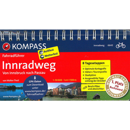 Kompass cykelguider/kort har spiralryg og er trykt på lamineret papir. Serien har modtaget 1.præmie ved verdens største rejsemesse ITB for dens uovertrufne kvaliteter. Lette overskuelige kort i målestokken 1:50.000, selvforklarende symboler, grafisk oversigt over rutens højdeprofil og længde, gennemsnitlige varighed og andre praktiske fakta. Forfatternes tips til de bedste seværdigheder, områdets historie og geografi. De enkelte etaper er tydeligt beskrevet med meget præcise kort og herlige farvefotos. Praktisk liste med overnatningsmuligheder inddelt i prisgrupper inkl. morgenmad. Her følger den tyske beskrivelse af denne guides indhold: 8 Tagesetappen von Innsbruck nach Passau.Rund 330 km radelt man von Innsbruck bis Passau auf einem der ältesten Flussradwege dahin. Über weite Strecken sind beide Uferseiten des Inns zu befahren - daher bietet der Innradweg mehr als 500 km abwechslungsreiches Radvergnügen von der TirolerLandesmetropole bis zur niederbayerischen Dreiflüssestadt.Dieser Teil des Innradweges ist durchwegs flach und daher einfach zu befahren: ein familientaugliches und kinderfreundliches Unternehmen, das auch in Einzelabschnitte "aufgeteilt" werden kann.Dominieren im ersten Drittel herrliche Bergkulissen (Karwendel, Kaisergebirge) das Panorama, so bestimmt im Mittelteil die bayerische Moor- und Seenlandschaft das Bild. Zum Finale lenkt man das Rad durch das Europareservat Unterer Inn, eines der flora- und faunareichsten Naturschutzgebiete im europäischen Binnenland.