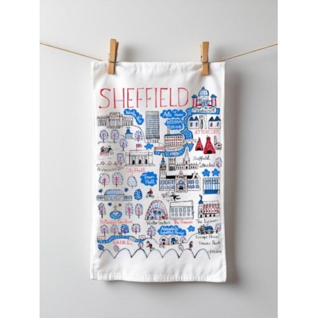 Julia Gash Cotton Tea-towel - Sheffield. Our luxuriously thick tea towels are created using 100% cotton and printed in the UK. Featuring some of the UK's most iconic cities and beautiful landscapes, illustrated by Julia in her spirited handwriting.
