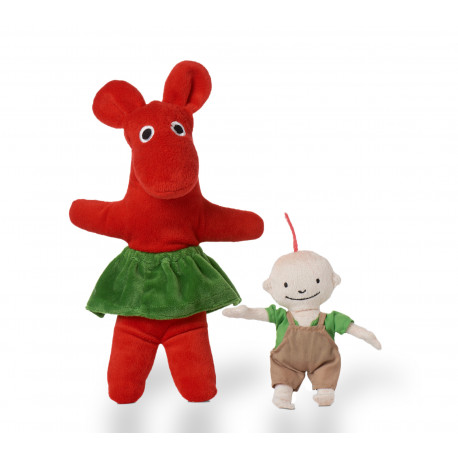 Kaj og Dukkelise plysdukker, der passer til de kendte Kaj-bøger.