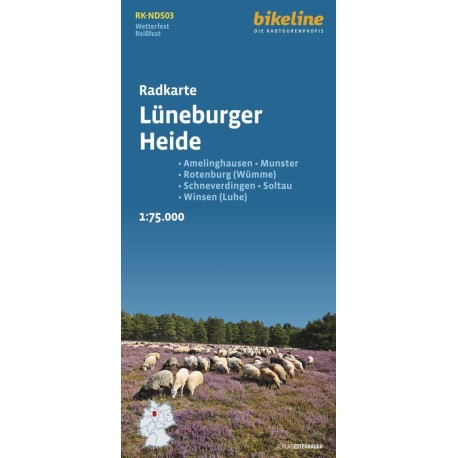 Falset cykelkort i målestokken 1:75.000 over Lüneburger Heide. Kortet er trykt på vand- og rivefast papir. På kortet finder du information om vejbelægning og trafikbelastning, og udvalgte vejnavne. Stignings- og afstandsangivelser samt de vigtigste turistinformationer. Kortnummer RK-NDS03.