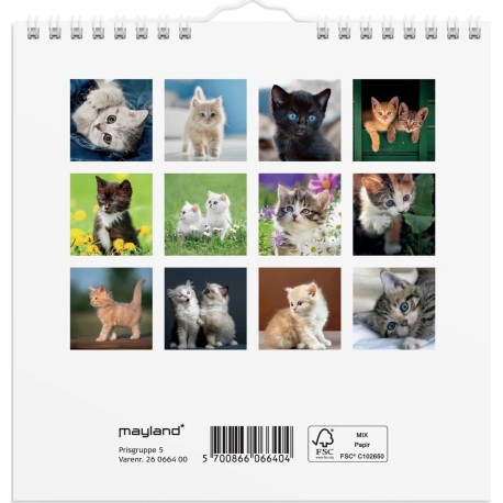 Vægkalender i karton med søde billeder af kattekillinger. Kalenderen er spiralindbundet og giver dig en oversigt over 1 måned ad gangen med plads til noteringer, så du hurtigt og nemt kan skabe et godt overblik over den enkelte måned.