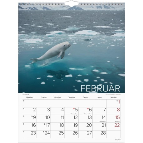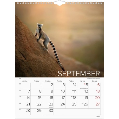 Vægkalender i karton med flotte billeder af verdens dyr. Kalenderen er spiralindbundet og giver dig en oversigt over 1 måned ad gangen med masser plads til noteringer, så du hurtigt og nemt kan skabe et godt overblik over den enkelte måned.