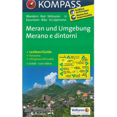 Falset plastlamineret vandre- cykel- og ski-kort over Merano og omegn i målestokken 1:50.000 og en 110 siders tysk/italiensksproget miniguide til hele området. Begge indsat i praktisk plastomslag. På bagsiden af kortet er trykt samme område i panoramaformat.