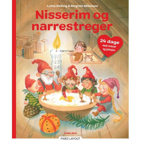 Kom i julestemning med Nisserim og narrestreger, der indeholder 24 remser om alt, hvad man lave i december, så nedtællingen til juleaften lettes. Bogen indeholder derudover masser af gode ideer til kreative og sjove sysler, både inde og ude, samt findeaktiviteter på hvert opslag. Kan du finde nisserne, som gemmer sig på alle siderne gennem bogen? Der kommer flere og flere til, jo tættere vi kommer på juleaften!Nisserim og narrestreger er både velegnet til brug i daginstitution og indskoling, men også derhjemme, og stimulerer krop, sprog og motorik, samtidig med at julestemningen breder sig ...Bogen er varmt og stemningsfuldt illustreret af Birgitte Ahlmann.Fra ca. 3 år.