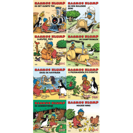 Denne Pixi®-serie indeholder otte gode historier med Rasmus Klump og alle hans venner: