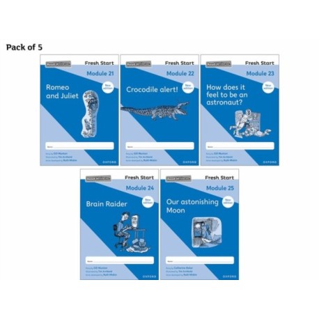 This 2024 edition of Read Write Inc. Fresh Start rescues students aged 9 and above who are below age-related expectations, using a phonics-based approach. The Modules are specially written to help students catch up on and develop reading and writing skills. This pack includes stories about astronauts, Romeo and Juliet, and crocodile facts.