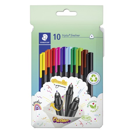 triplus® fineliner 334 •Trekantet fineliner med superfin, metalbeklædt spids. •Ergonomisk trekantet form for afslappet og let skrivning. •DRY SAFE - kan efterlades uden låg i dagevis uden at tørre op, undtagen neonfarver. •Vandbaseret blæk. •Vaskes let ud af de fleste tekstiler. •PP-tønde garanterer lang levetid. •Stregbredde ca. 0,3 mm. •Krop fremstillet af 97 % genanvendt plast. Kartonetui med 10 triplus fineliner produceret af 97% genanvendt plast i assorterede farver.