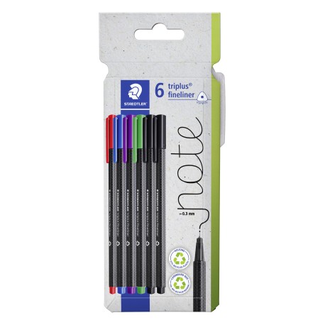 triplus® fineliner 334 •Trekantet fineliner med superfin, metalbeklædt spids. •Ergonomisk trekantet form for afslappet og let skrivning. •DRY SAFE - kan efterlades uden låg i dagevis uden at tørre op, undtagen neonfarver. •Vandbaseret blæk. •Vaskes let ud af de fleste tekstiler. •PP-tønde garanterer lang levetid. •Stregbredde ca. 0,3 mm. •Krop fremstillet af 97 % genanvendt plast. Kartonetui med 6 triplus fineliner lavet af genanvendt plastik i assorterede farver.