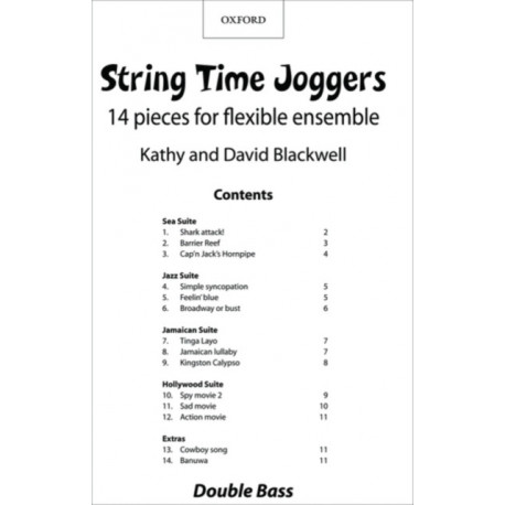 The optional double bass part provides a bass line for the pieces in String Time Joggers. Most pieces use the finger pattern 0-1-4. The second finger is also used in two pieces.