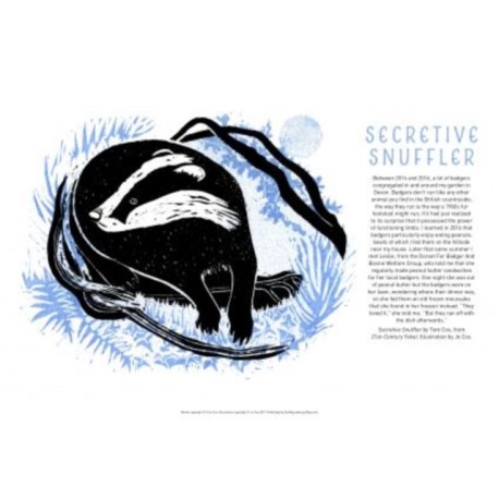 Secretive Snuffler features Jo Cox's beautiful lino print of a badger, above a passage of text about this enchanting creature from Tom Cox's book 21st Century Yokel, the latest title by the Sunday Times bestselling author and social media sensation. -- Cyngor Llyfrau Cymru