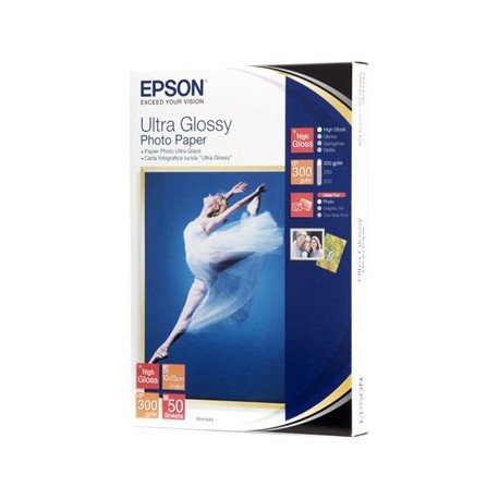 Ultra Glossy Photo Paper, 10x15 cm (4x6 in), 300 g/m2Epsons topkvalitets fotopapir har en højglans finish, som er perfekt til at printe dine favoritbilleder og forstørrelser på - for at opnå de mest ultimative resultater. Dette papir er smudsafvisende og vandafvisende med en blød, klar hvid, resin belagt overflade.